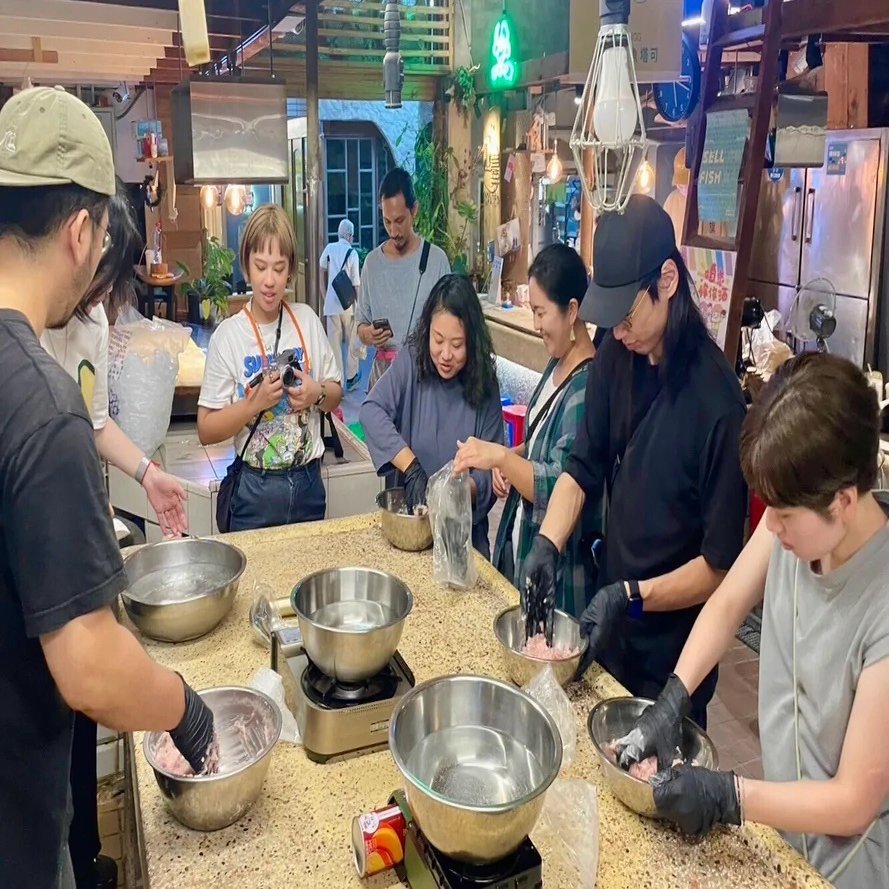 皆で家庭料理づくりの体験。これは「魚丸」を作っているところ